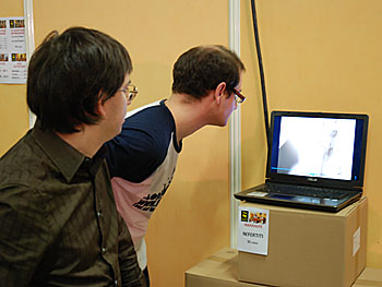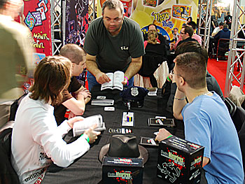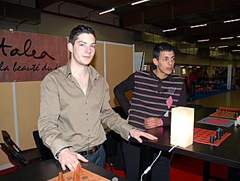 Sur le stand Matagot, Hicham et Thomas admirent la superbe vidéo de présentation réalisée pour Néfertiti.