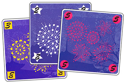 Bonus : Lorsqu'un joueur termine un feu d'artifice en posant la carte 5, il remet un jeton bleu dans le couvercle de la boite, et ce, sans défausser de carte. Si tous les jetons bleus sont déjà dans la boite, le bonus est perdu.