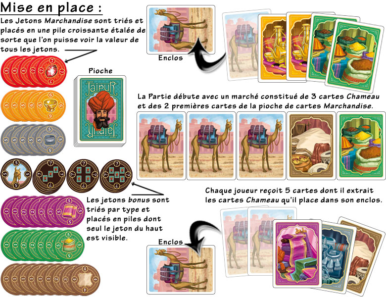 Les 55 cartes Marchandise et Chameau sont mélangées, après que l'on ait prélevé 3 cartes Chameau que l'on place entre les joueurs. Chaque joueur reçoit 5 cartes, le restant est posé en pioche, face cachée, sur la table. On retourne les 2 premières cartes de cette pioche, que l'on place à côté des 3 cartes Chameau, les 5 cartes constituant ainsi le marché de départ.