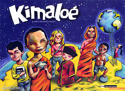Kimaloé est un jeu particulier, tout d'abord parce qu'il traite d'un sujet plutôt sensible et original pour un jeu de société : les droits de l'enfant. Il s'agit en fait d'une commande spécifique du Secteur Jeunesse de Terre des Hommes - Aide à l'enfance (Lausanne). Les enfants ont des droits fondamentaux qui, de part le monde, ne sont malheureusement pas toujours garantis de la même manière. Le propos du jeu c'est de donner l'opportunité de changer cet état de fait, les joueurs munis de leurs camions et de leurs cartes "droits" vont parcourir tous les continents de la planète afin de participer à des projets d'aide aux enfants. Le but ultime (qui malheureusement semble bien utopique) sera de rivaliser de solidarité afin de se rapprocher d'une terre idéale, une compétition fort louable s'il en est !