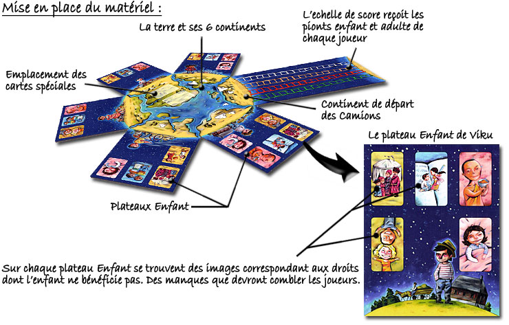 Le plateau de jeu représente une terre avec 6 continents. On place sur 5 d'entre eux, autant de plateaux Enfant tirés de la pioche que l'on aura constituée avec les 15 plateaux présents dans la boîte. Le 6ème recevra les 2 plateaux échelles mis bout à bout.