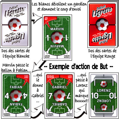 Note = Chaque équipe dispose, en début de partie, de 8 cartes "but" dans son paquet. Les probabilités de marquer d'une équipe diminuent donc au fur et à mesure qu'elle marque des buts...
