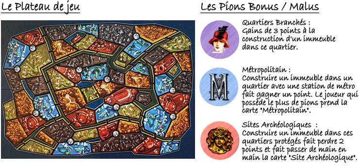 - Pour chacun des 5 arrondissements, le joueur qui possède la construction la plus haute gagne 5 points supplémentaires.