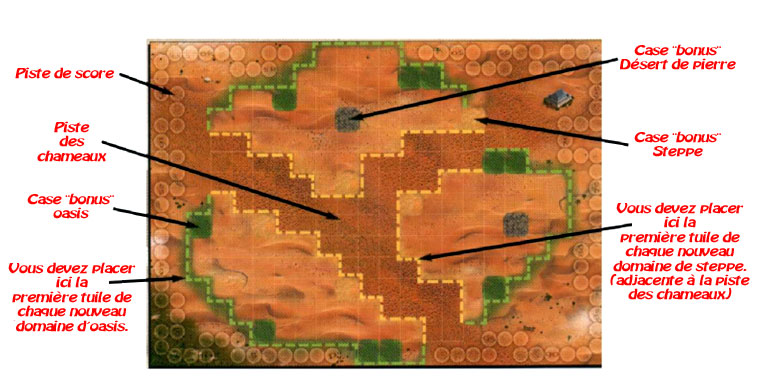 - la première tuile d'un domaine "Steppe" doit impérativement être adjacente à la "piste des chameaux" ou une case-bonus "steppe" imprimée sur le plateau..