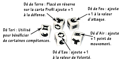 Du côté de la mécanique, Okko est un jeu d'affrontement/escarmouche que l'on peut qualifier de léger. En effet, le choix dans le cas d'Okko, est de privilégier une mise en place rapide et une immersion efficace, servies par des règles plutôt simples et accessibles pour un jeu d'affrontement, avec pour objectif de toucher un public large. Le jeu parvient à atteindre son but grâce aux visuels aux petits oignons tiré de la BD, et à un principe de jeu basé sur des dés d'inspiration qui sont le "nerf de la guerre" ou plutôt de l'affrontement ! Comprenez ici que ce sont ces dés et leur bonne gestion qui feront souvent la différence, alors bien sûr, dés obligent, le hasard est présent, mais il est partiellement contrôlable grâce à la possibilité de mettre des dés en réserve sur les cartes Profil, dés que l'on pourra utiliser lors de sa prochaine phase ou durant la phase adverse. L'autre ressort mécanique important d'Okko, c'est le principe des zones de contrôle et du soutien possible qu'il induit : avancer de manière groupée permet d'être plus costaud en attaque comme en défense grâce au soutien mutuel entre les personnages...