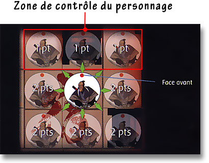 Autre spécificité d'Okko : les zones de contrôle. Une zone de contrôle est une ligne imaginaire constituée des 3 cases se trouvant devant le personnage, ce qui rend son orientation primordiale ! Bien gérer les zones de contrôle de ses propres personnages, mais aussi de ceux de son adversaire sera souvent la clef d'une tactique gagnante...