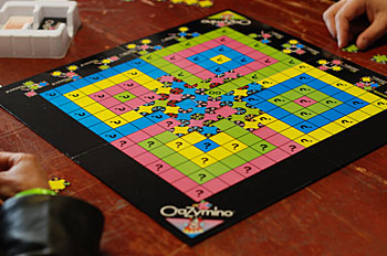 Ca c'est le Crazymino, un jeu de Simon Armanini auto-édité (et distribué). Le jeu est une version un peu folle des dominos où il faut faire des combinaisons de chiffres et de couleurs pour marquer des points.