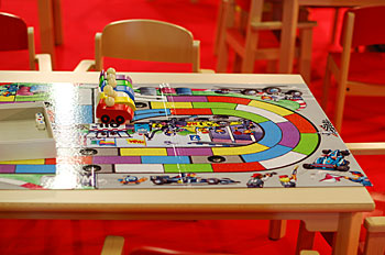 Le Stand de la ludothèque de Boulogne, en avant plan une partie de Tumblin Dice en cours...