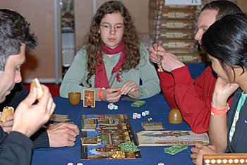 Dice Town : le joueur de droite semble très absorbé par la lecture de sa carte.