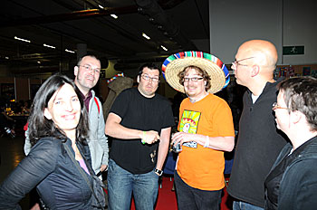 ...tandis que ça déconne dur entre (de gauche à droite) Mimi, Tibi (Nicolas de BoiteCast), Piérô, Thomas (Provoost), Cédric et Anne-C. Notez la ressemblance entre Tibi et Pierô. Tibi ferait en fait parfois la doublure, pour les cascades, de Pierô (bah oui ça peut être dangereux le métier d'illustrateur, il y a les crayons aiguisés, les poignets douloureux et tout ça ).