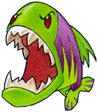 - Il tombe à l'eau parceque le joueur ne possède plus assez de pierres pour le maintenir à sec : Il est dévoré par les piranhas...