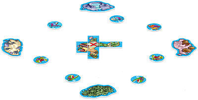 On place au centre de la table l'île de départ, les 4 autres îles sont positionnées aux 4 points cardinaux autour de l'île de départ à environ 45cm. Dans la surface de jeu ainsi créée on place les 7 pions piranhas qui représentent autant d'obstacles.