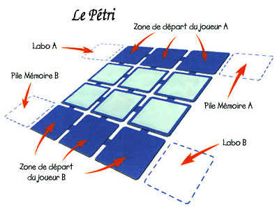 Le "plateau" est un damier imaginaire (sauf si l'on possède un pack deluxe qui contient un plateau modulable) de 4 rangées de 3 cases représentant le Pétri. La rangée la plus proche de chaque joueur étant sa zone de départ.
