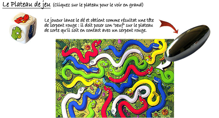 Le principe du jeu est très simple : Le joueur dont c'est le tour lance le dé et doit placer un de ses oeufs sur le plateau de manière a ce qu'il soit en contact avec un serpent de la couleur désignée par le dé.