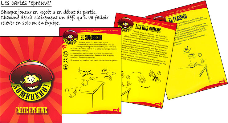 Qu'on se le dise ! Sombrero c'est du concentré de fun et de bonne humeur ! Alors certes on pourrait objecter qu'il ne s'agit que de reprendre le jeu des sous-bocks que tout un chacun peut déjà avoir pratiqué de son côté, mais ce serait minimaliste de présenter Sombrero de cette manière. En effet les cartes Epreuve et les défis qu'elles proposent, permettent de faire varier les plaisirs, par des épreuves qui se joueront soit en solo, soit en équipe et pour lesquelles on choisit avec qui on va jouer (adversaires comme coéquipier), certaines se pratiquent même avec tous les joueurs en simultané.