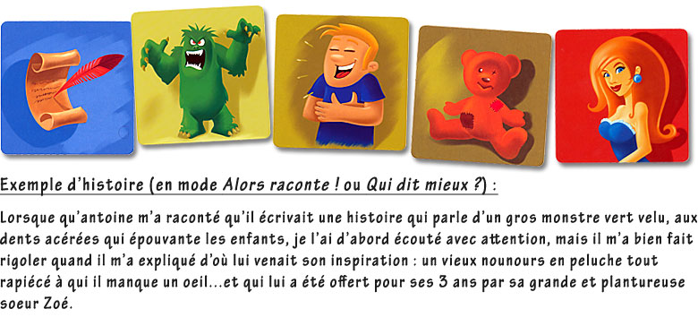 Chaque joueur pioche 3 cartes qu'il regarde...ou pas, selon le choix des joueurs. L'objectif ici sera de raconter une histoire collective la plus étonnante possible. Un joueur débute l'histoire à partir d'une de ses cartes qu'il dévoile, puis son voisin de gauche prend le relais en découvrant une de ses cartes sur laquelle il appuie la suite du récit et ainsi de suite...Le joueur qui joue la dernière carte improvise la chute de l'histoire et la partie s'arrête.