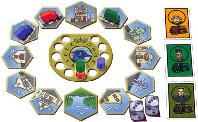 12 tuiles, symbolisant la ville, sont placées en cercle autour du tableau des paris. Chaque joueur choisit sa couleur et démarre la partie muni de sa camionnette et de son pion de pari.