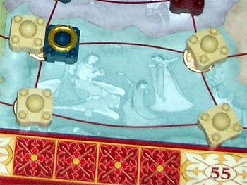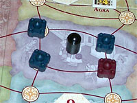 La troisième province voit se dérouler presque le même scénario, hormis que c'est Mimi qui décide d'un retrait immédiat et pioche donc une carte supplémentaire. Je fais l'erreur de croire que mes cartes sont suffisantes pour tenir tête à Stef (qui en a récupéré 3 au tour précedent)...résultat je me retrouve de nouveau avec seulement 2 majorités, les mêmes qu'au tour précedent, le vizir et la couronne de grand Moghol alors que Stef récolte les 4 autres.