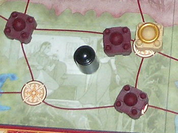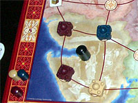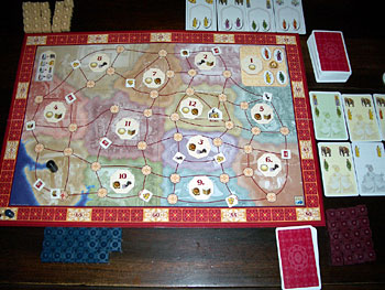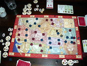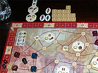 Mimi nous a fait une belle démonstration de ce qu'il faut faire à Tadsch Mahal. Tout d'abord il est essentiel de bien gérer sa main de carte, il faut éviter autant que possible les combats qui s'éternisent (et donc coûteux en cartes) surtout si leur rapport n'est pas des plus intéressant. Ensuite il est trés important de bien jauger les points potentiellement présents sur chaque province et essayer de bien se préparer pour celles qui paraissent importantes. Il ne faut pas hésiter, par exemple, à se retirer d'emblée dans la province précédente afin de récupérer une carte supplémentaire et d'être le premier à chosir ses cartes dans la réserve, afin de se préparer au mieux pour la province à venir.