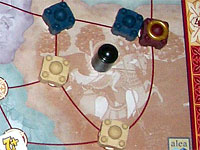 Grâce à ce coup fumant, Stef vient de marquer 11 points ! (4 dûs aux connexions entre ses palais, 5 grâce aux ressources collectées et 2 amenés par le jeton bonus +2) et se permet même de passer en tête, 1 point devant Mimi.