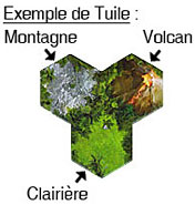 Chaque tuile est composée de trois champs hexagonaux. L'un de ces champs un sera toujours un volcan, les deux autres seront des terrains de type jungle, clairière, plage, montagne ou lac.