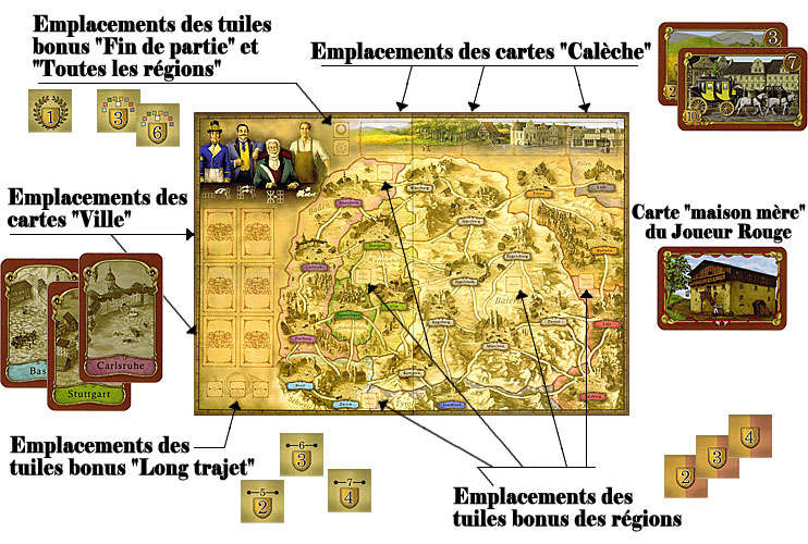 On place ensuite le plateau au centre de la table et chaque région va recevoir 3 ou 4 tuiles bonus. Reste à placer les tuiles bonus "long trajet" (pour les trajets de 5, 6 ou 7 villes), les tuiles bonus "toutes les régions" et la tuile bonus "fin de partie" sur les emplacements qui leurs sont attribués.