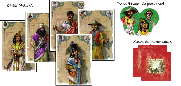 - Ajouter un Prince : Le joueur peut soit dépenser une carte "Action" pour placer un Prince sur un quartier occupé par un monument de la même civilisation, si le quartier est contrôlé par un autre joueur, ce dernier empoche immédiatement 1 point de prestige, soit dépenser 3 cartes "Action" identiques pour ajouter un Prince de la même civilisation sur le quartier de son choix.
