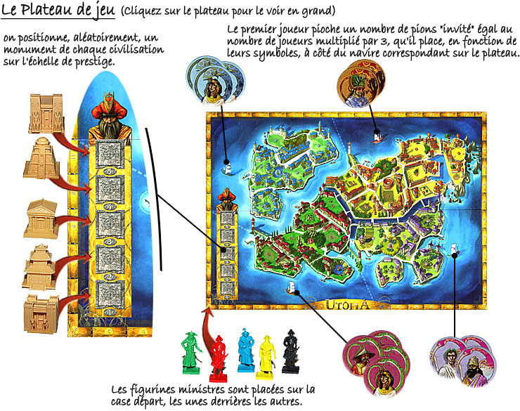 Après avoir placé le plateau de jeu, qui comporte 24 quartiers disséminés sur 4 îles de couleurs différentes, au centre de la table, on positionne, aléatoirement, un monument de chaque civilisation sur l'échelle de prestige. A coté du plateau on pose le sac contenant les 40 pions "invité", puis chaque joueur choisit sa couleur et prend les pions, socles et figurines de sa couleur et les place devant lui. Les figurines "Ministre" sont placées sur la case départ de la piste de score, les unes derrière les autres, en commençant par le premier joueur et en poursuivant dans le sens horaire.