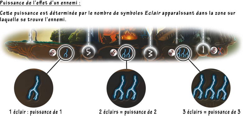 puissance d'effet de la zone d'arrivée de Fenrir. Pour réussir à le calmer, le joueur lance le dé et doit faire : 1 éclair=blanc, bleu ou vert / 2 éclairs = Blanc ou bleu / 3 éclairs = Blanc.